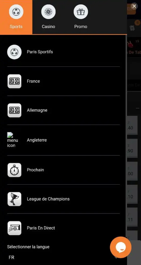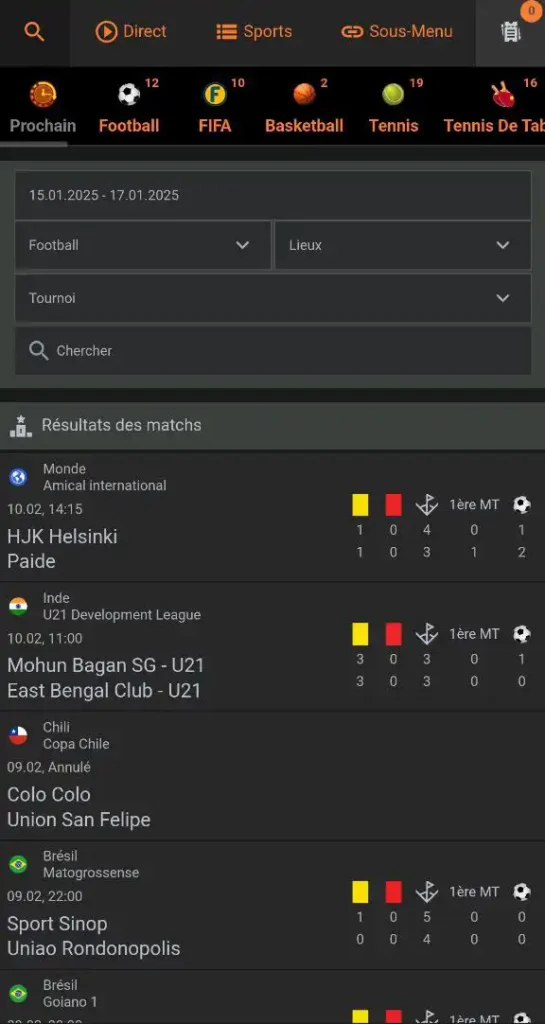 - Parcourir les événements sportifs : Naviguez parmi les sports disponibles et sélectionnez l’événement qui vous intéresse.